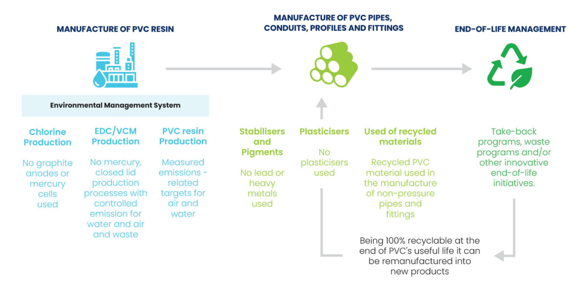 The Green Building Council of Australia (GBCA), working with PIPA and the Vinyl Council of Australia, reviewed the full lifecycle of PVC—from raw materials to end-of-life—and established Best Environmental Practice (BEP) PVC. These requirements were adopted across Australian standards, allowing combined certification and simplified marking for products meeting both plumbing and environmental standards. PIPA continues to collaborate with the GBCA under their Responsible Products Framework.