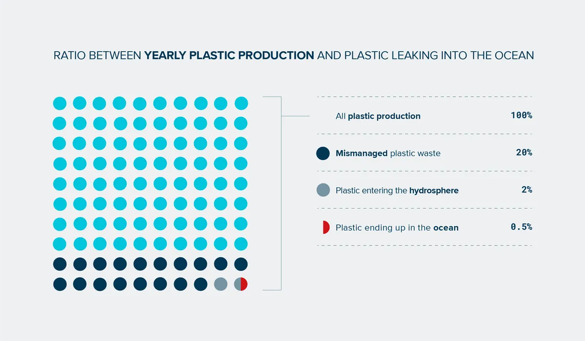Every day, plastic leaks into the ocean from thousands of sources worldwide. While the numbers sound alarming, less than 0.5% of the 400 million tons of plastic produced each year actually ends up in the ocean. That’s because only a small share of plastic is mismanaged, and an even smaller amount reaches waterways.